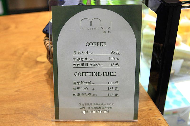 得在一樓點餐結帳,找尋好喜歡位置就可來告知座位與餐點,MU Patisserie沐林甜點烘焙坊明德店菜單,這裡是以甜點為主的咖啡廳,販售甜點為主,咖啡與氣泡飲選擇不用多,可搭配甜點恰恰好,低消每人250元,有甜點、咖啡、茶氣泡飲。