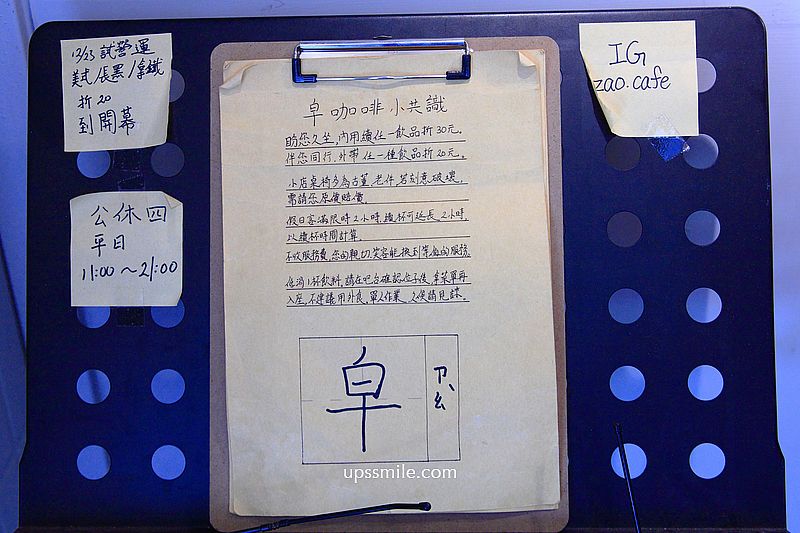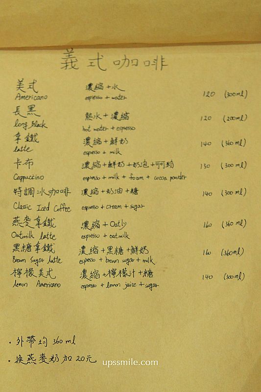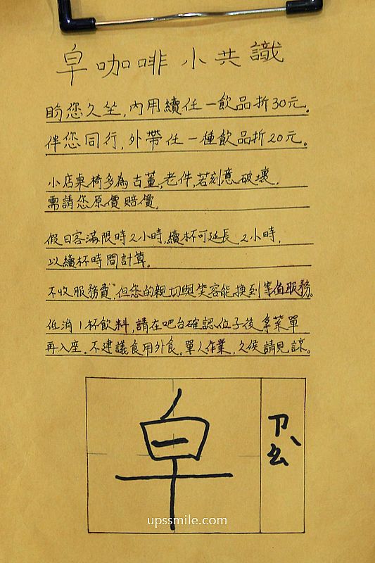 皁咖啡菜單,內用低消每人一杯飲品,平日不限時咖啡廳,假日限時2小時,提供手沖單品咖啡、義式咖啡、茶、手作甜點等。