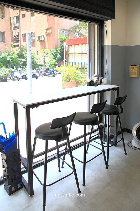 高腳椅座位,面對街邊風景,窗景位置,採光明亮,光線充足。角落一書架,架上擺放餐具,湯匙餐具在架上請自取,貼心備有兒童餐具,無提供兒童座椅。