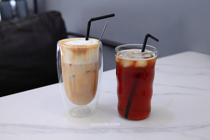 拿鐵咖啡130元、英式伯爵茶100元,拿鐵咖啡,中烘焙,堅果奶油香氣,順口香濃。英式伯爵茶100元,獨特英式茶香,散發淡淡佛手柑的甘橘茶風味。