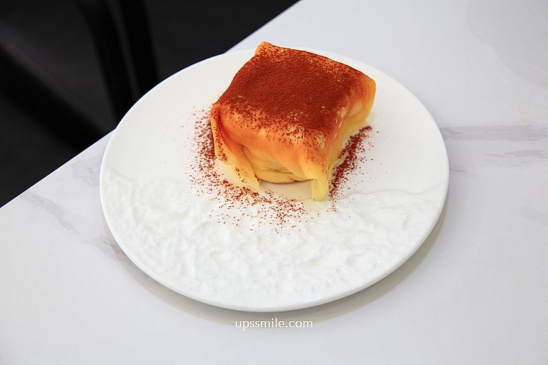 提拉米蘇生乳磚90元,這款是原味千層餅皮包覆舒芙蕾與提拉米蘇慕斯,雙重奏甜點組合,撒上可可粉,獨特巧克力香,餅皮帶有Q韌度伴隨蛋香,裡頭舒芙蕾蓬鬆軟彈嫩口口感,使用細滑提拉米蘇慕斯餡料,濃郁提拉米蘇風味平衡,一次吃到兩種甜品口感。
