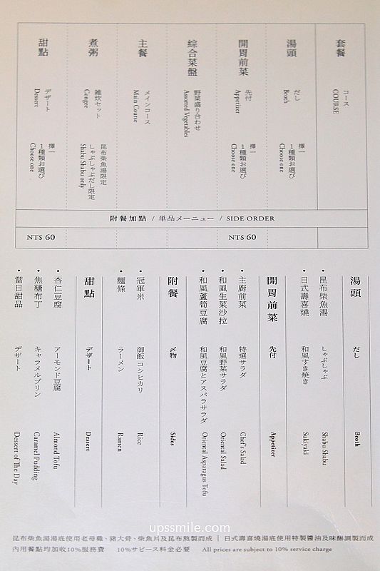 點了伊比利黑毛豬套餐1380元、頂級沙朗套餐1650元,主廚前菜 和風番茄、和風生菜沙拉,甜點選擇杏仁豆腐,飯後煮粥稀飯,招待手羽先。這天吃完,平均一人約1000多元,會酌收10%服務費,一分錢一分貨,好食材好料理,價格自然高貴,此生必吃一次的台北高檔火鍋。