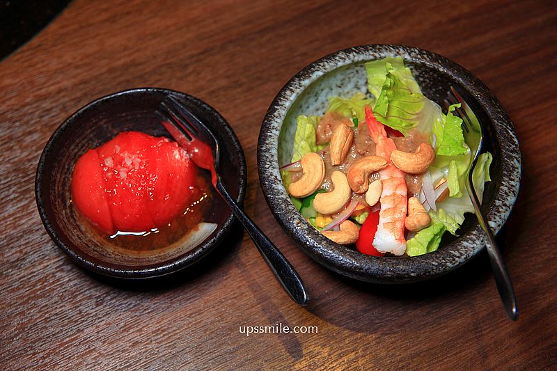 和風生菜沙拉,用羅美生菜、堅果、小黃瓜、番茄、海鮮組合,淋上胡麻沾醬,清爽脆甜。和風蕃茄,番茄去皮,醃漬處理,浸在和風醬油上,酸甜開胃。