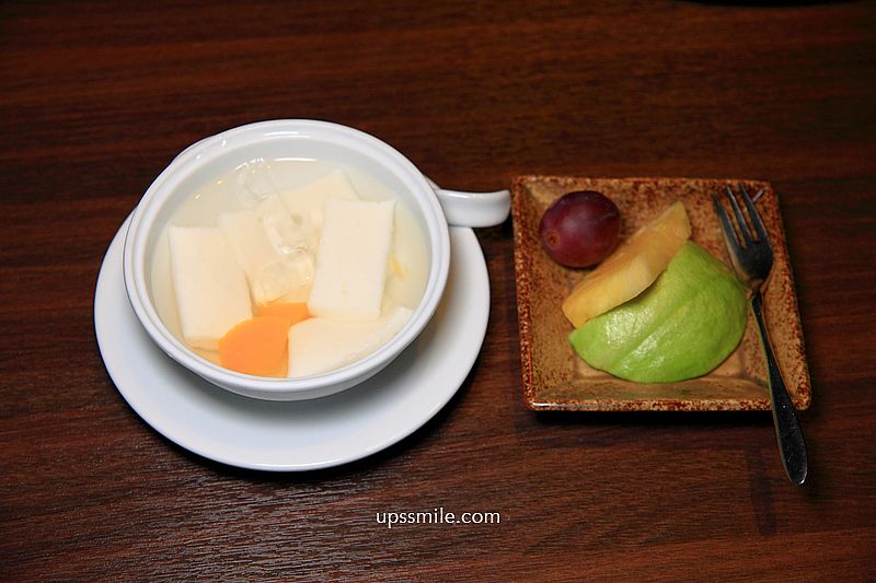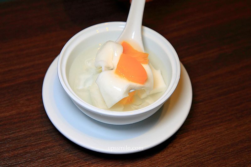 飯後甜品水果與杏仁豆腐,杏仁豆腐不馬虎,沒有難聞杏仁味,杏仁天然手工做法,彈嫩細緻,好滑溜,帶點甜的糖水,不愛吃杏仁豆腐的萍子,每來必選這款杏仁豆腐,自然原味甜品,讓人滿足。