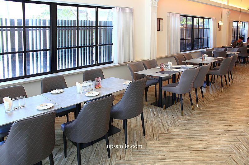 映入眼簾,挑高空間,鐵皮屋建築,鋪上斜紋木頭地板,擺放大理石桌面,北歐風椅,店內幾十張座位區,可容納30幾人空間,適合家人與三五好友聚餐,整個水泥灰色調,大量木質,少了冰冷感。