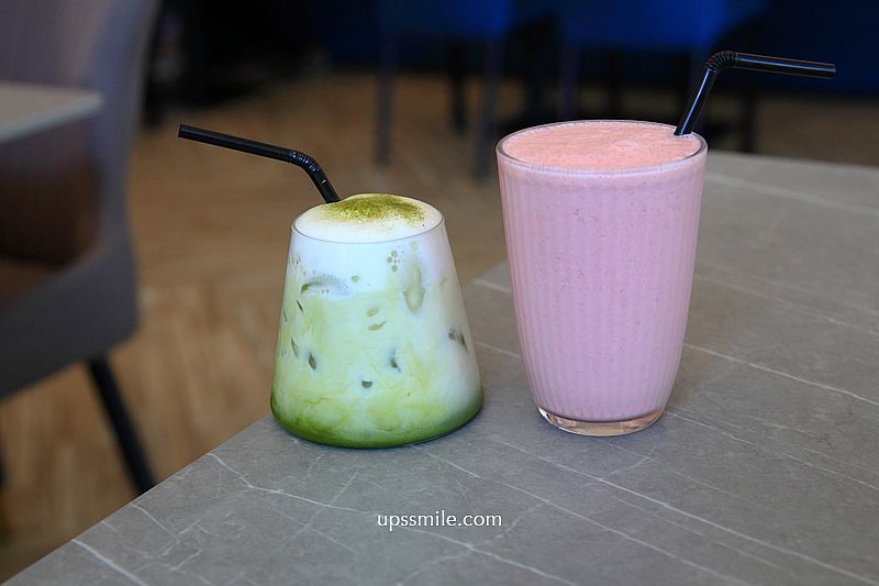 飲品選擇草莓牛奶180元、抹茶鮮奶150元,每款飲品用玻璃杯裝,讓飲品看起來很好喝。草莓牛奶,非常濃郁草莓味,草莓果香,奶香厚實。抹茶鮮奶,使用日本抹茶粉,抹茶苦甘,帶點甜,好喝。