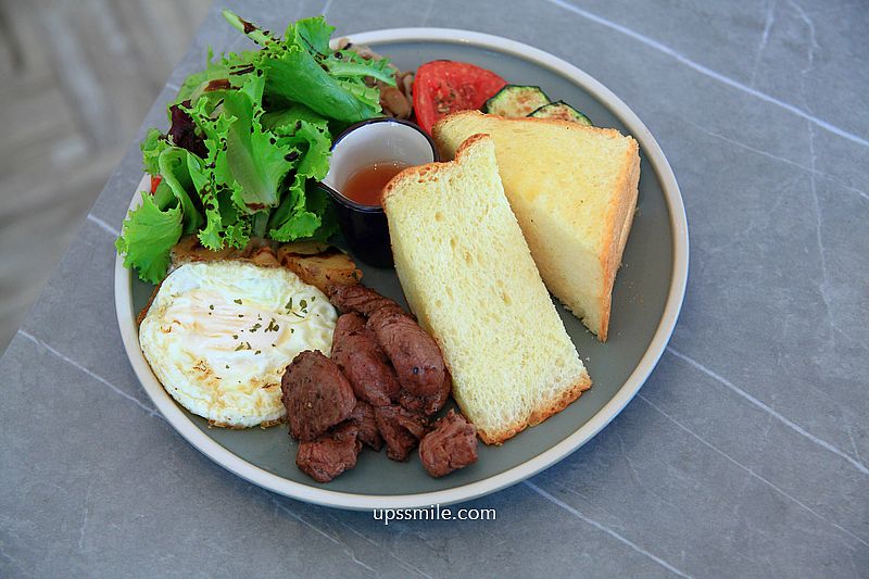 美式菲力大盤拼早餐盤450元,宛如丹麥厚片吐司,其實是手撕麵包,整個烤到金黃酥脆外層,內部吃下鬆軟彈嫩,搭配生菜沙拉、菲力、蛋組合,很豐盛上桌。