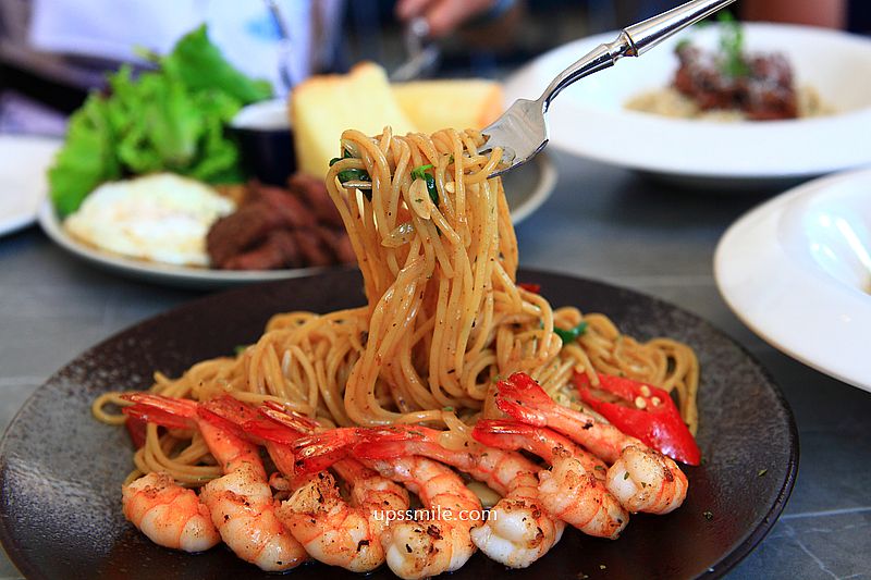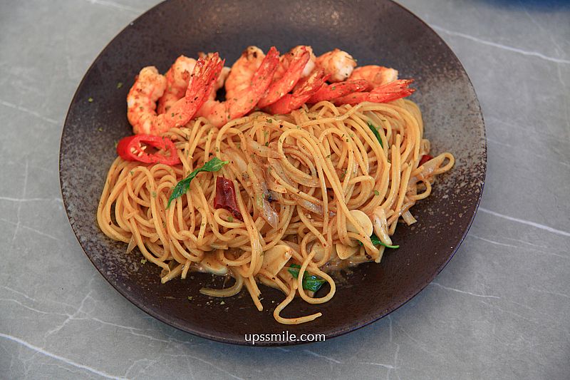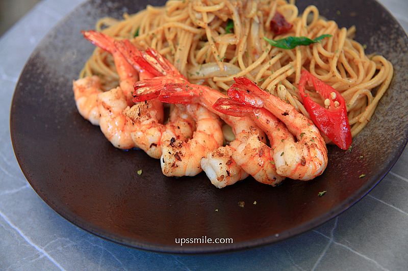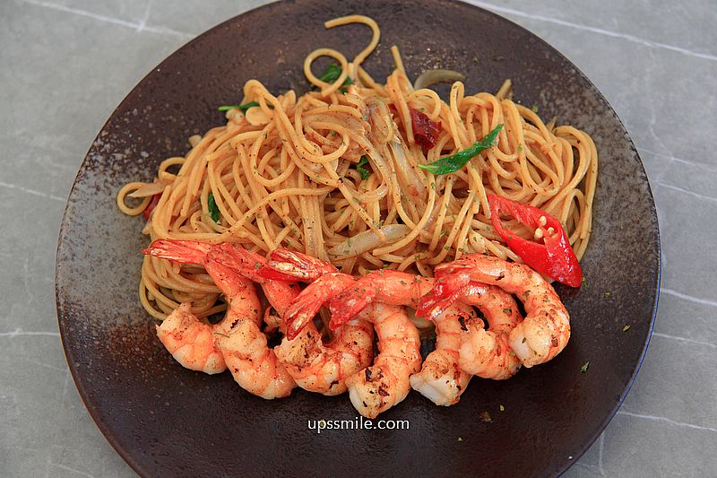 義大利麵使用細麵條,不是寬扁麵,沒有麵條會糊的問題,麵條吸附醬汁,清炒義大利麵,有著濃郁的蒜頭香氣,涮嘴開胃,主廚特別把蝦頭熬成醬汁,用蝦醬與義大利麵炒,造就蝦香很濃郁,鮮蝦整齊擺放,蝦鮮美,貼心去好蝦殼,入口不用擔心會沾手,鮮味多汁。