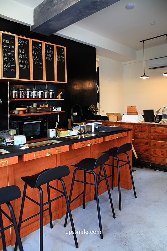 映入眼簾,整個黑色牆面,黑得發亮,店老闆自己油漆,設計打造日式混工業風氛圍,木質咖啡吧檯座位,開放式高腳椅吧台,用五金打造座位區,吧台上透明玻璃,未來將舉辦攝影展覽,與藝文結合。