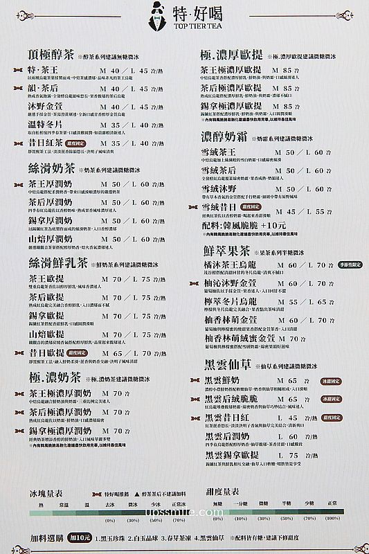 特好喝toptiertea特好喝逢甲店 推薦特茶王45元、茶后極濃厚潤奶70元、黑雲后潤奶60元