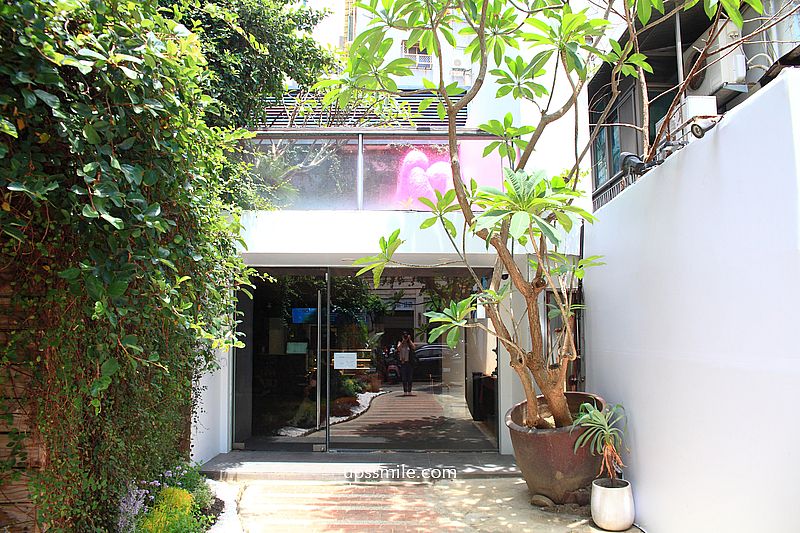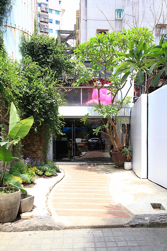 光看兩側植物延伸到紅磚路引導,戶外庭院造景,獨棟兩層樓落地窗玻璃矮房,讓人想一探究竟。