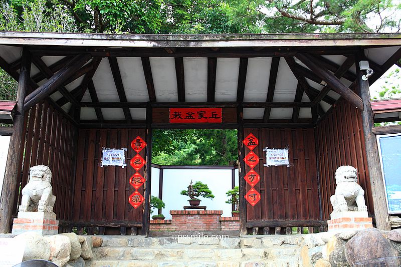 抵達到現場,可見斗大的「丘家盆栽陶藝教室」,門面打造日式混中國風木門造景,可從這入口入內,也可從上頭的另個出入口進入日式庭院,若你下午來,生意興隆,門口可停車,或是擺滿了重機車,可見好生意。