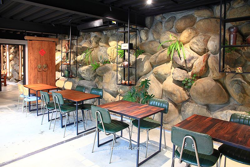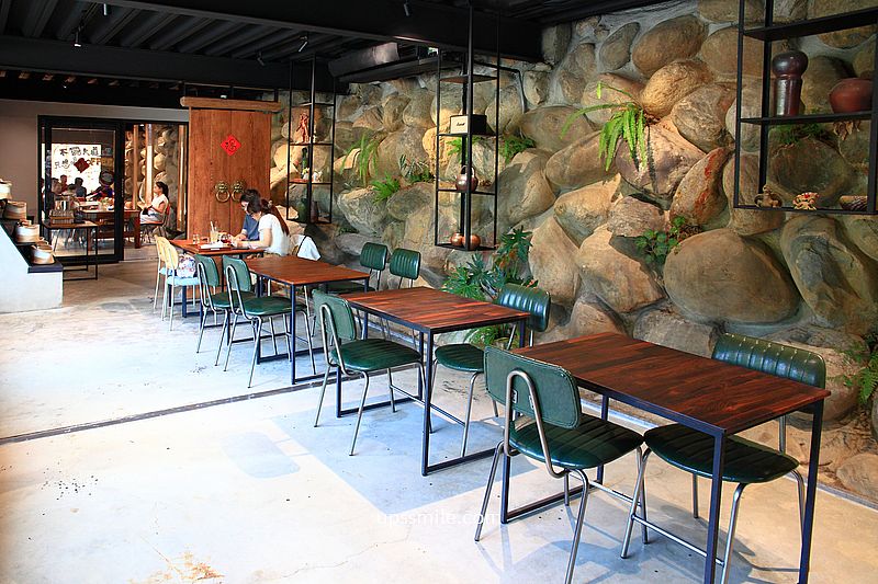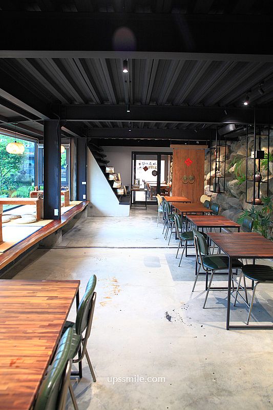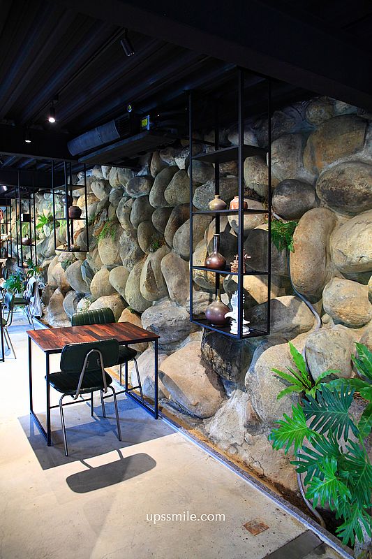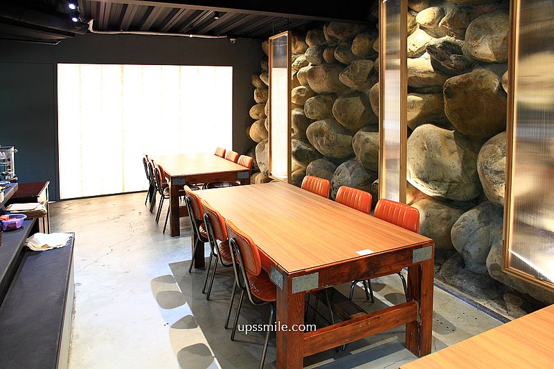 內用空間,長條型空間,牆面整片是石塊砌成牆,保留粗曠與自然感,質樸石頭觸感,一邊是靠牆的工業風四人座位,以及最熱門窗景的日式榻榻米網美空間,走道一分為二,很寬敞,少了壓迫感。