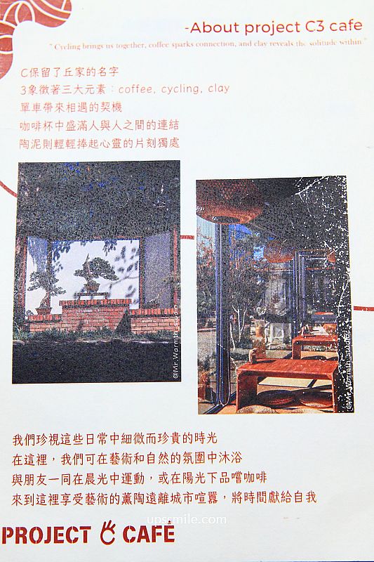 取名Project C3 cafe,C3是在苗栗卓蘭丘家的中的品牌空間,C保留了丘家的名字,而C3象徵著三大元素:單車(Cycling)、咖啡(Coffee)和陶藝(Clay),來自三位年輕人創業,打造了這裡,有藝術與植栽,藝術薰陶,咖啡空間。