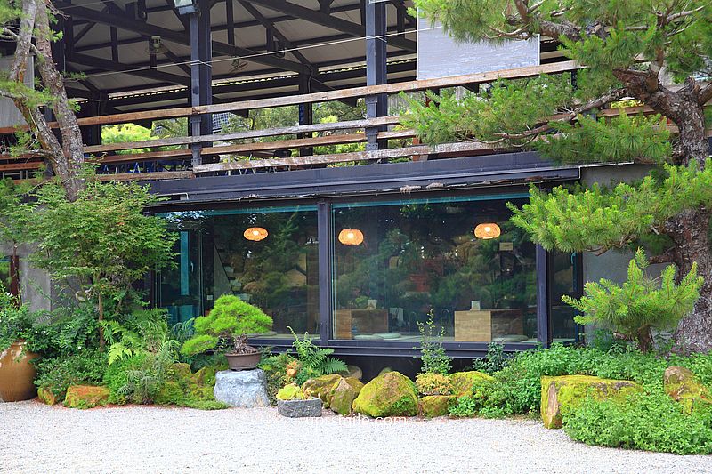 日式黑色落地窗玻璃屋,工業風混搭日式庭院造景,整個自然系景觀,秒殺快門,拍個不停。