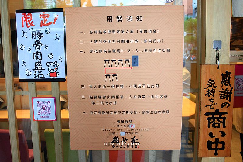 排隊順序,可見門口有一張介紹,每人低消一碗拉麵,跑贏偶不在此限,點餐機會出兩張單。入座後一張給店員,一張是收據,送餐速度很快。