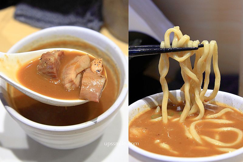 沾麵搭配的湯底,裡頭還可見豚骨叉燒肉,沾麵放入,蝦味道很濃郁,鮮美不腥,鹹香吸附麵條,好吃,湯底有燙口,不是冷冷的湯底,沾麵麵條很彈牙,滑溜有口感,好好吃。