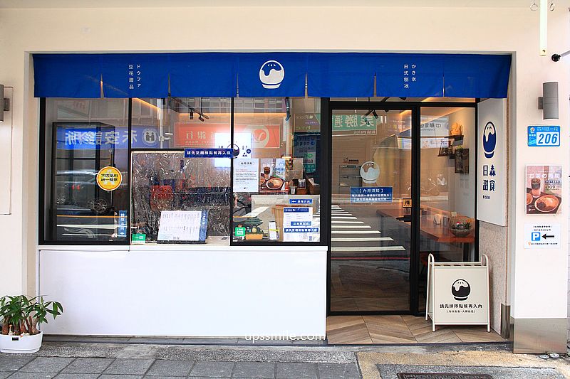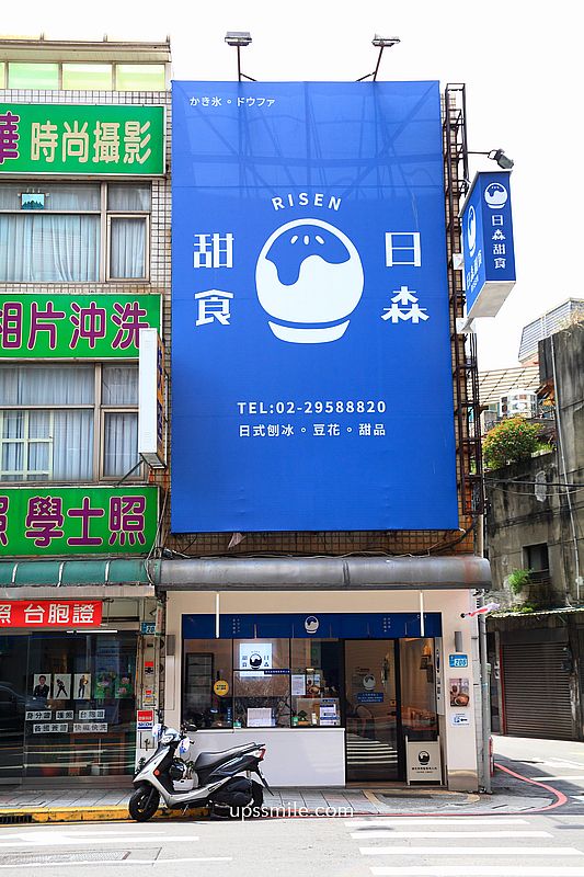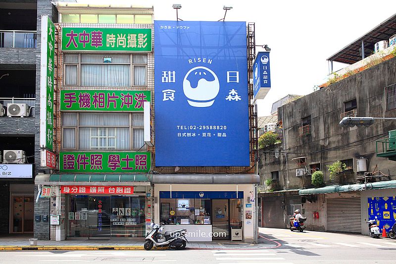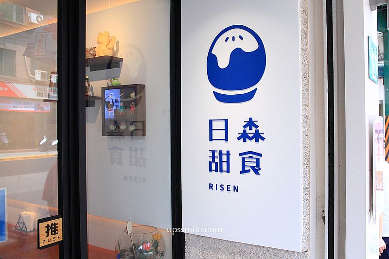 日森甜食RISEN位於新北市板橋區四川路一段上,車水馬龍位置,周邊板橋民宅大樓林立,地處邊間位置,整個藍色日系風裝潢,日式刨冰logo圖樣,小巧可愛,散發文青風,讓人路過,收入口袋名單,終於找天朝聖了。