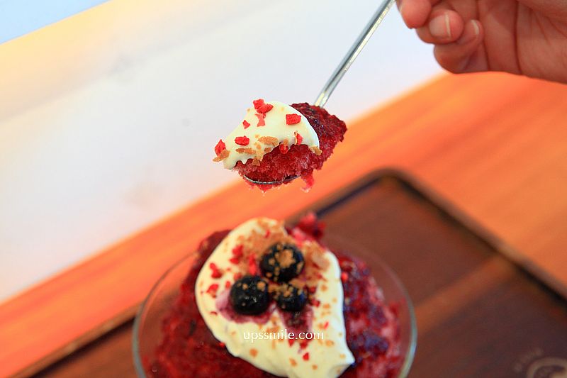 莓果乳酪刨冰135元,手工綜合莓果醬、招牌乳酪醬、冷凍藍莓、小脆片、凍乾草莓丁,一整個火紅色澤上桌,宛如小山造型刨冰,木盤裝,光看就好誘人,視覺系冰品。