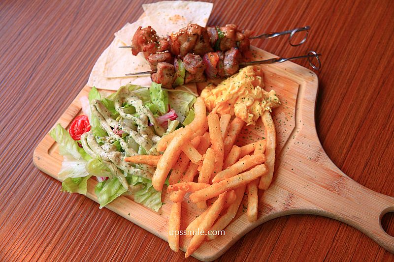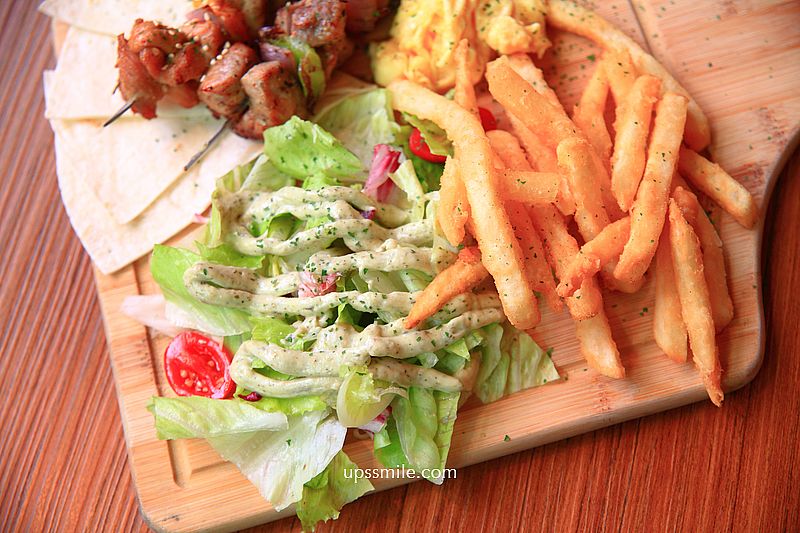 招牌肉串早午餐319元,經典肉串2串、墨西哥餅、凱薩沙拉、酥炸薯條、炒蛋,木盤裝上桌,擺盤豐富,很誘人。