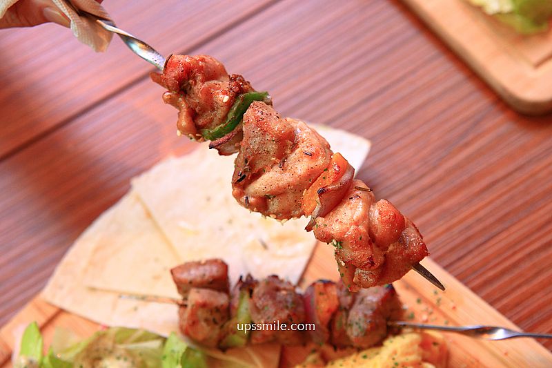 經典肉串2串,有希臘蜂蜜香料豬肉串、優格芝麻醬烤雞肉串,用烤肉串當主餐,豬肉肉質軟嫩,獨特炭烤香,吃起來不油膩,好吃有水準。