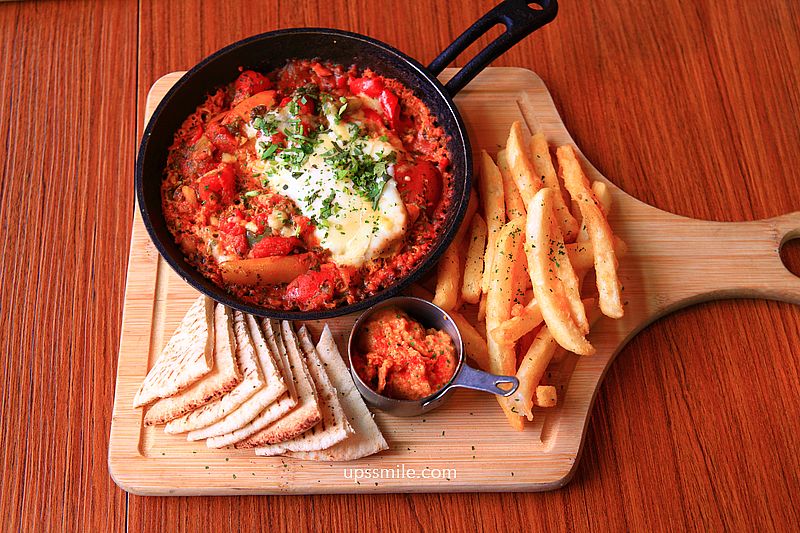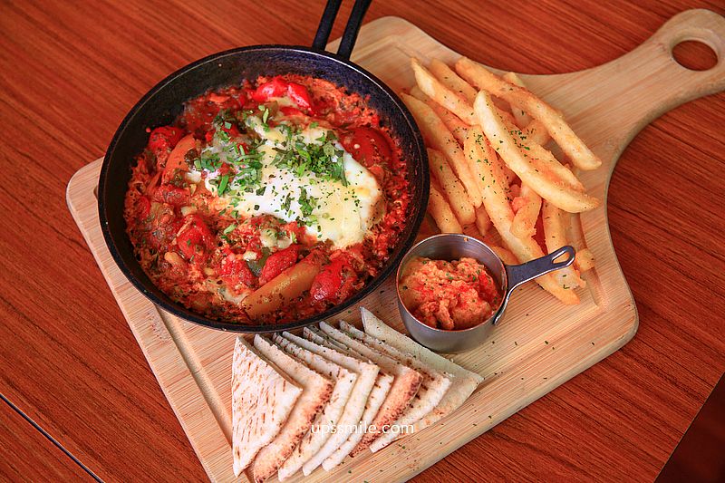 夏樹卡燉菜早午餐319元,有夏樹卡燉菜、鷹嘴豆泥、批塔麵包、酥脆炸薯,充滿異國風料理早餐盤。夏樹卡燉菜早午餐是指在早午餐中包含夏樹卡(Shakshuka)一種餐點。 夏樹卡是一種中東和北非的料理,主要由番茄、洋蔥、辣椒、香料和雞蛋製成,通常會搭配麵包食用。店內提供了一道名為「夏樹卡燉菜」早午餐,據稱是將多種香料、紅椒、黃椒、番茄和雞蛋燉煮後,加入起司並撒上香菜,創造另一種作法。