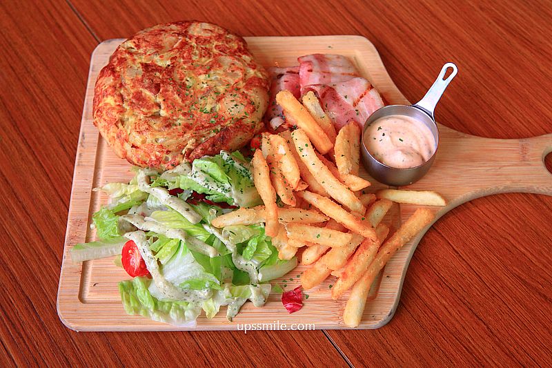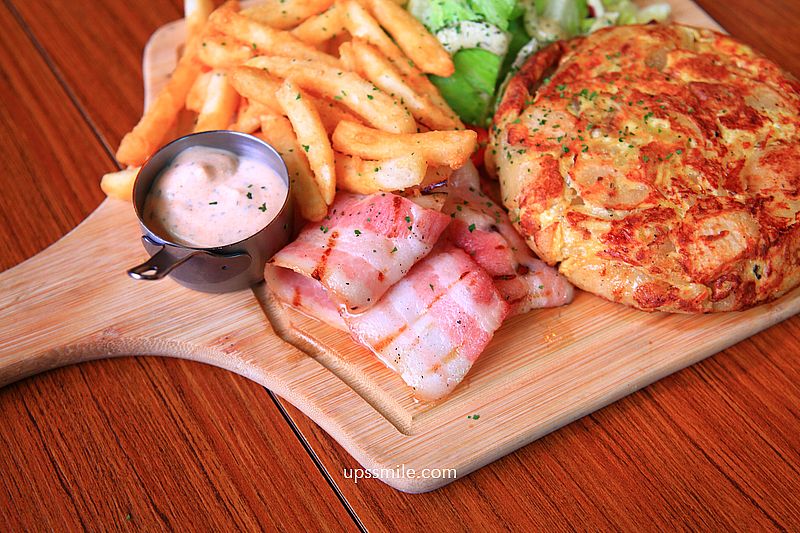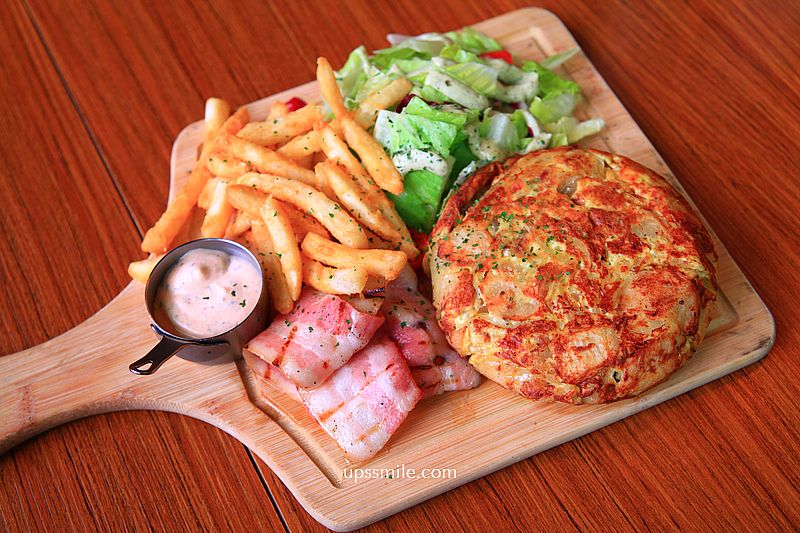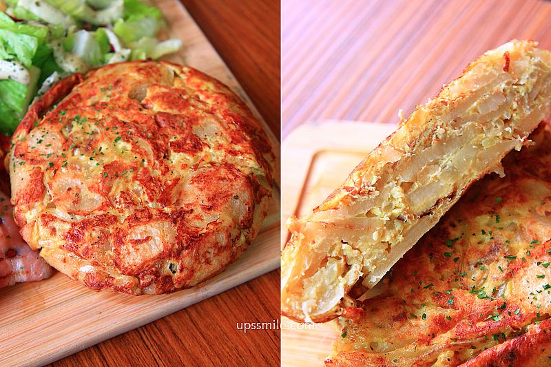 西班牙經典原味馬鈴薯蛋餅早午餐319元,有經典原味馬鈴薯蛋餅、凱薩沙拉、酥脆薯條、香煎培根等,免出國,輕鬆可吃到的招牌西班牙國民美食,一整個圓餅狀厚實蛋餅,帶有濃厚蛋香上桌,非常誘人。