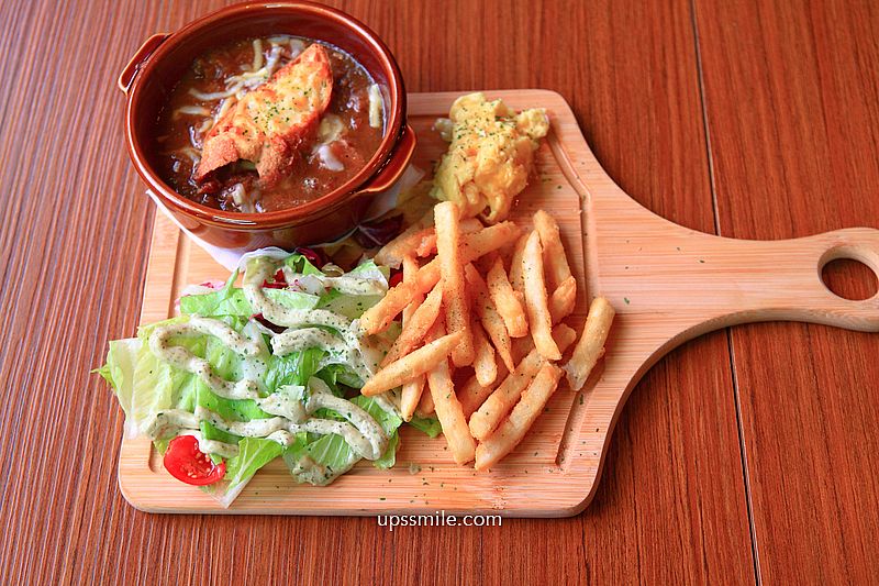 法式牛肝箘洋蔥燉牛筋早午餐319元,有法式牛肝箘洋蔥燉牛筋、炒蛋、凱薩沙拉、酥脆薯條,木盤裝呈現,主餐換一餐食,很豐盛擺盤。