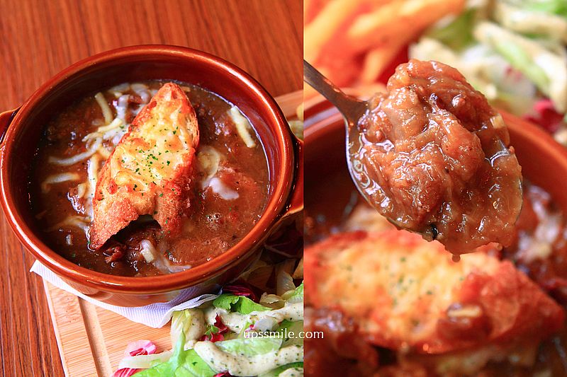 牛肝箘洋蔥燉牛筋,把牛筋燉煮入味,上頭放上一片焗烤過的歐式麵包,多了咀嚼層次,酸甜風味,結合了牛筋的膠質、牛肝菌的獨特風味,包含洋蔥本身熬煮後的甜味,燉煮後味道豐富,口感軟嫩。