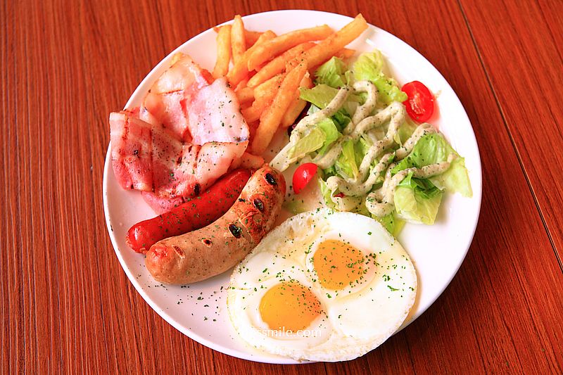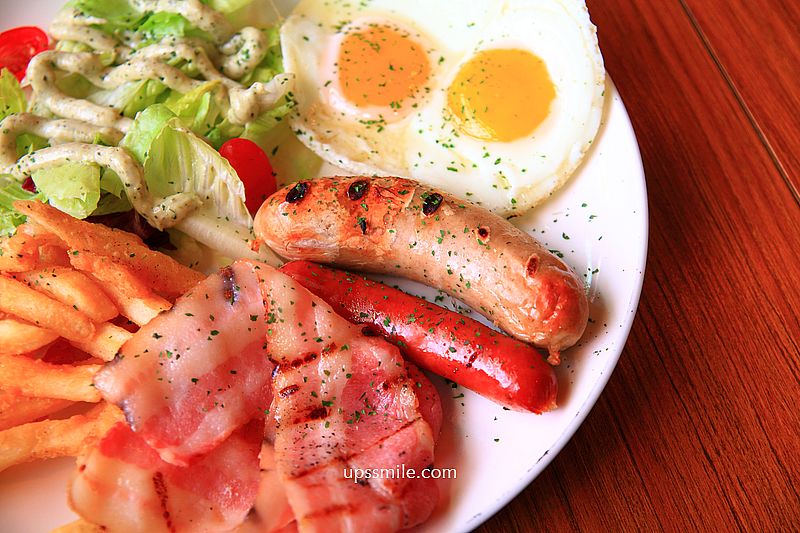 經典歐式早餐盤319元,有德國煙燻香腸(豬肉)、慕尼黑小牛肉腸、凱薩沙拉、酥脆薯條、太陽雙蛋、香煎培根等,白盤裝,宛如到歐式餐廳吃早餐盤擺盤,輕鬆在店內也可吃到。