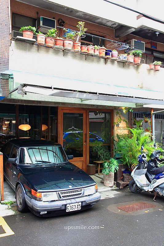 門口擺放一台復古汽車SAAB 9000,店老闆的車,感受復古風老宅咖啡廳魅力。