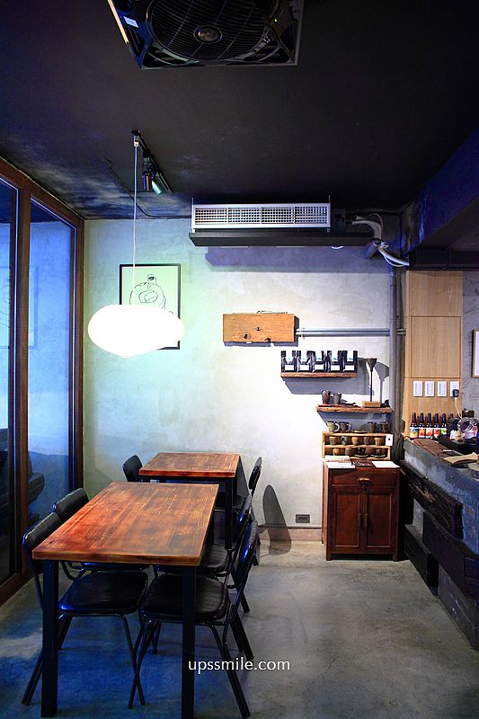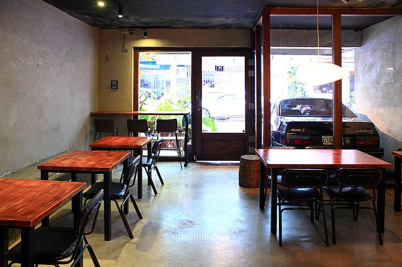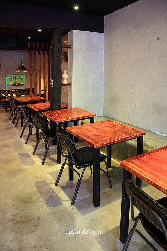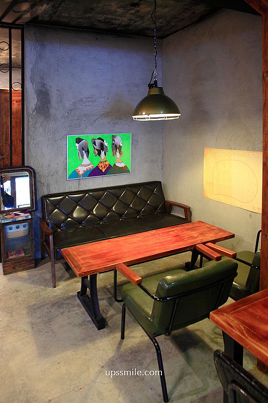 映入眼簾,長條形空間,水泥灰粉刷地板,復古風,木質傢俱,工業風氛圍,鐵件與工業風吊燈元素,少了冰冷感,打上黃色燈光,多了暖意。