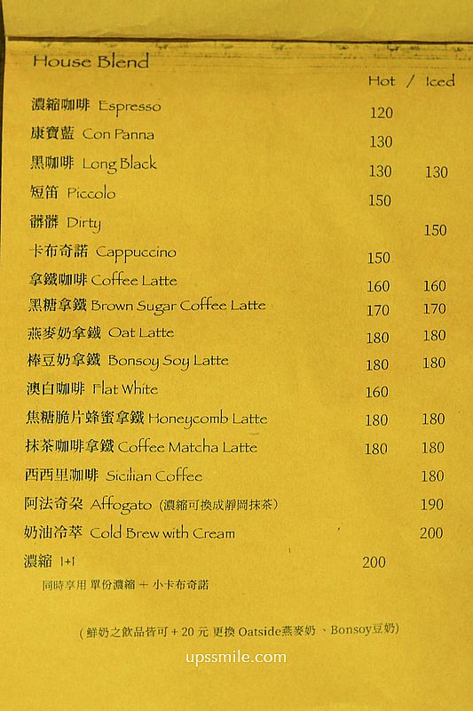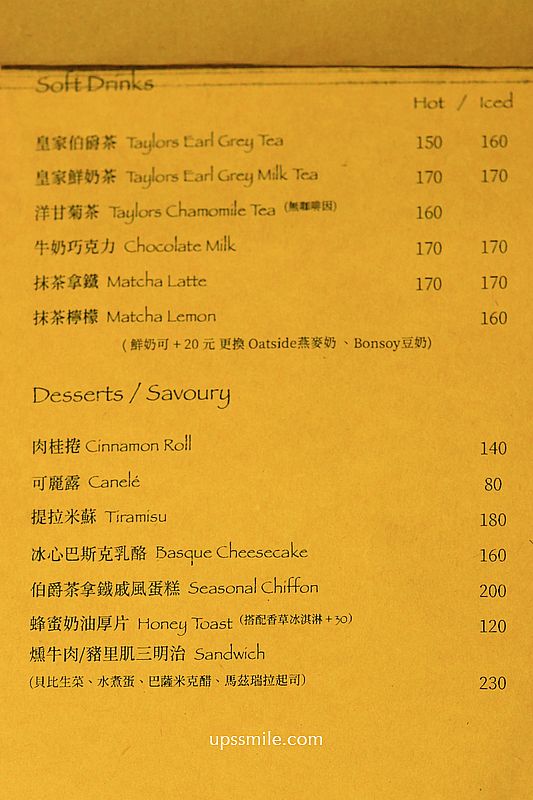 金福咖啡菜單,低消一杯飲品,限時2小時,提供咖啡、甜點、抹茶、茶等。