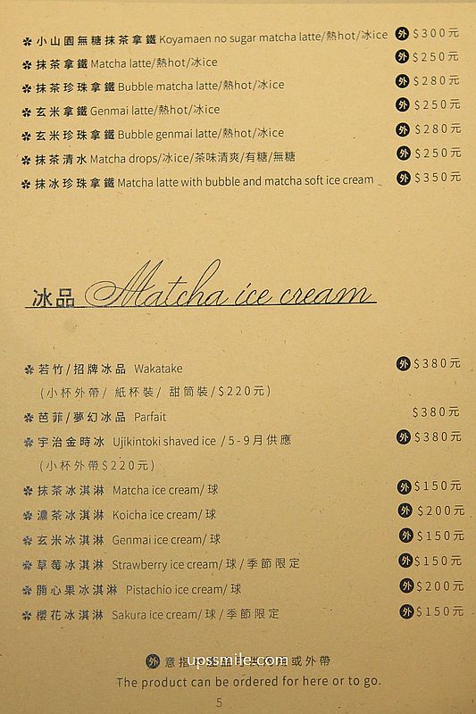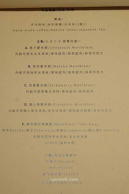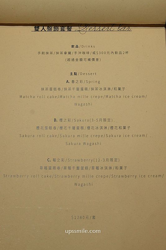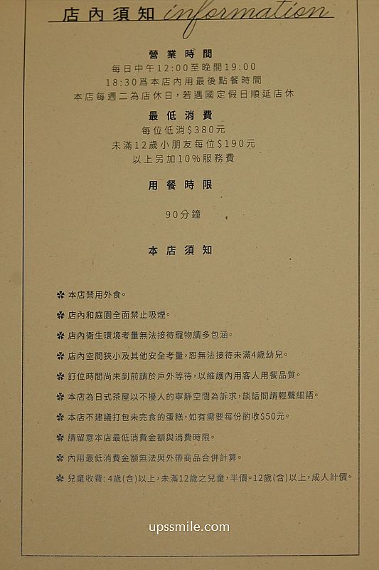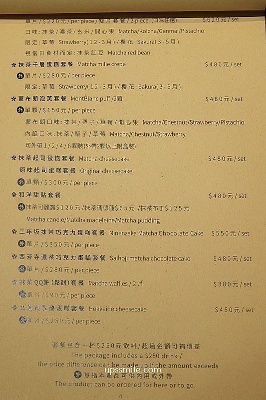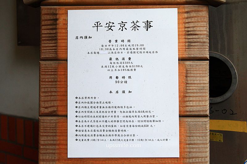 平安京茶事菜單,低消每位380元,會酌收10%服務費,限90分鐘用餐,餐點豐富多樣,季節佐甜點,從春天的櫻花、夏日的芒果、秋日的栗子、冬季的草莓等,讓人一年四季都想品嚐,提供抹茶、甜點、手沖單品咖啡等,本店不提供免費打包服務,如有需要每份酌收50元包材費用。
