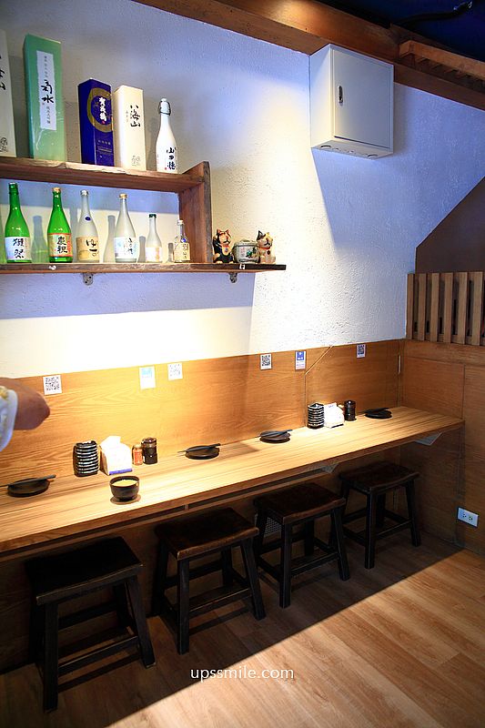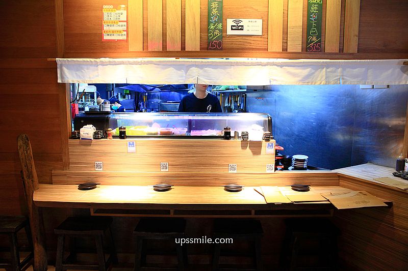 盡頭則是生魚片吧台,近距離可見師傅切生魚片一景,吧台前方也可用餐,四人座位區,巧妙運用。