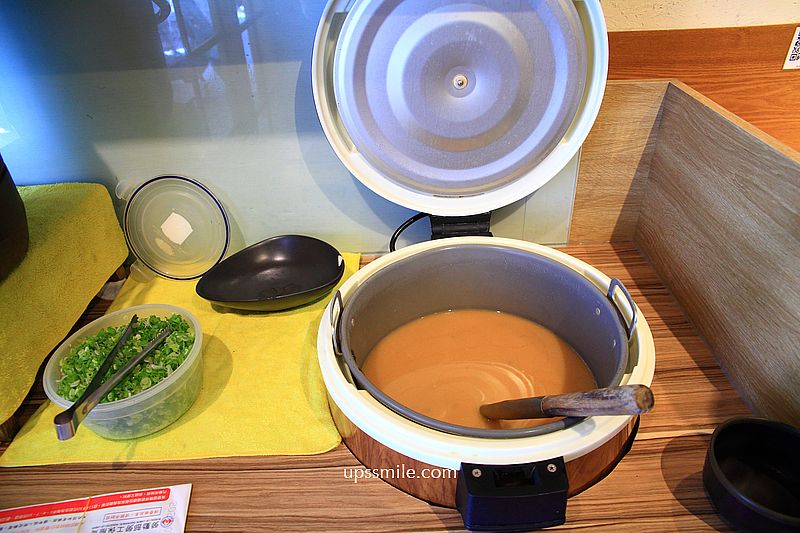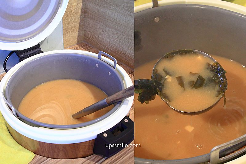 前半部開放式平台自助區,免費提供茶水與味增湯,提供味增湯一整大鍋,擺放青蔥,這裡味增湯免費提供,味增湯喝到飽。